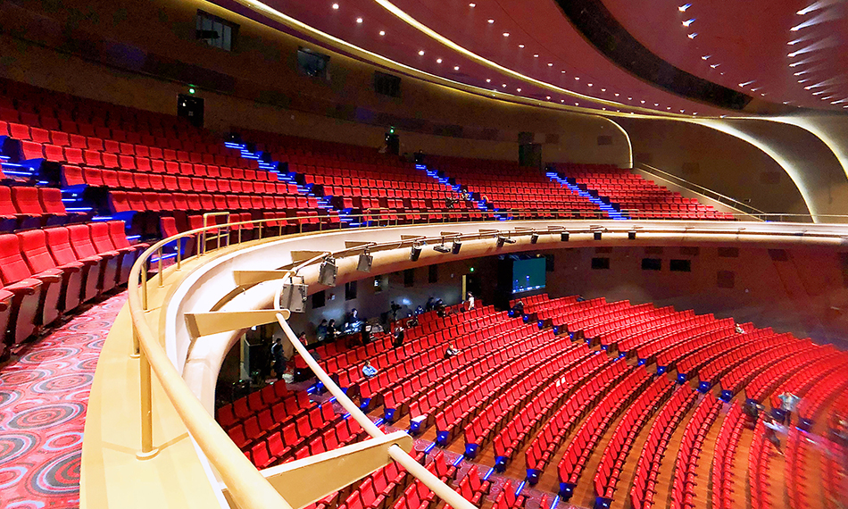 位于青島市黃島區(qū)西海岸經(jīng)濟新區(qū)中央商務(wù)區(qū)內(nèi),總建筑面積約2.4萬平米,包含一個1970座的特大型劇院及設(shè)施的配套空間。大劇院是為國際電影節(jié)打造的文化建筑,舉辦一年一度的國際電影節(jié),成為電影節(jié)開、閉幕式及頒獎典禮的圣殿。大劇院需滿足大型文藝演出、現(xiàn)場交響樂演奏、全景聲電影放映的需求,這就要求大劇院擁有三套不同的聲學(xué)系統(tǒng):現(xiàn)場演出擴聲系統(tǒng)、全景聲電影還音系統(tǒng)、電子可變混響系統(tǒng)。仁歌技術(shù)團隊經(jīng)過精心設(shè)計、制作,實現(xiàn)了三套系統(tǒng)既可以獨立工作,又能夠在不同使用需求時系統(tǒng)的智能結(jié)合。