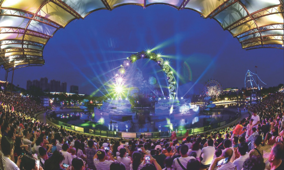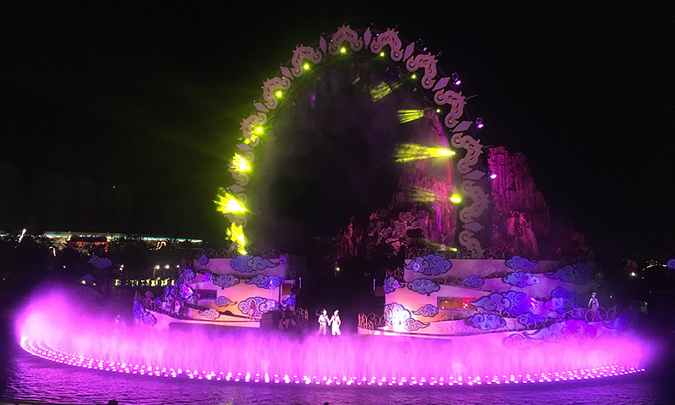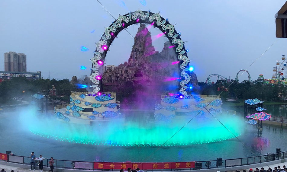 室外大湖秀:演出以室外噴泉表演、燈光、音響、投影等舞臺設(shè)備為主,組成一場完整的水上聲光秀,本場演出位于廣州室外主題樂園的海上絲路區(qū)